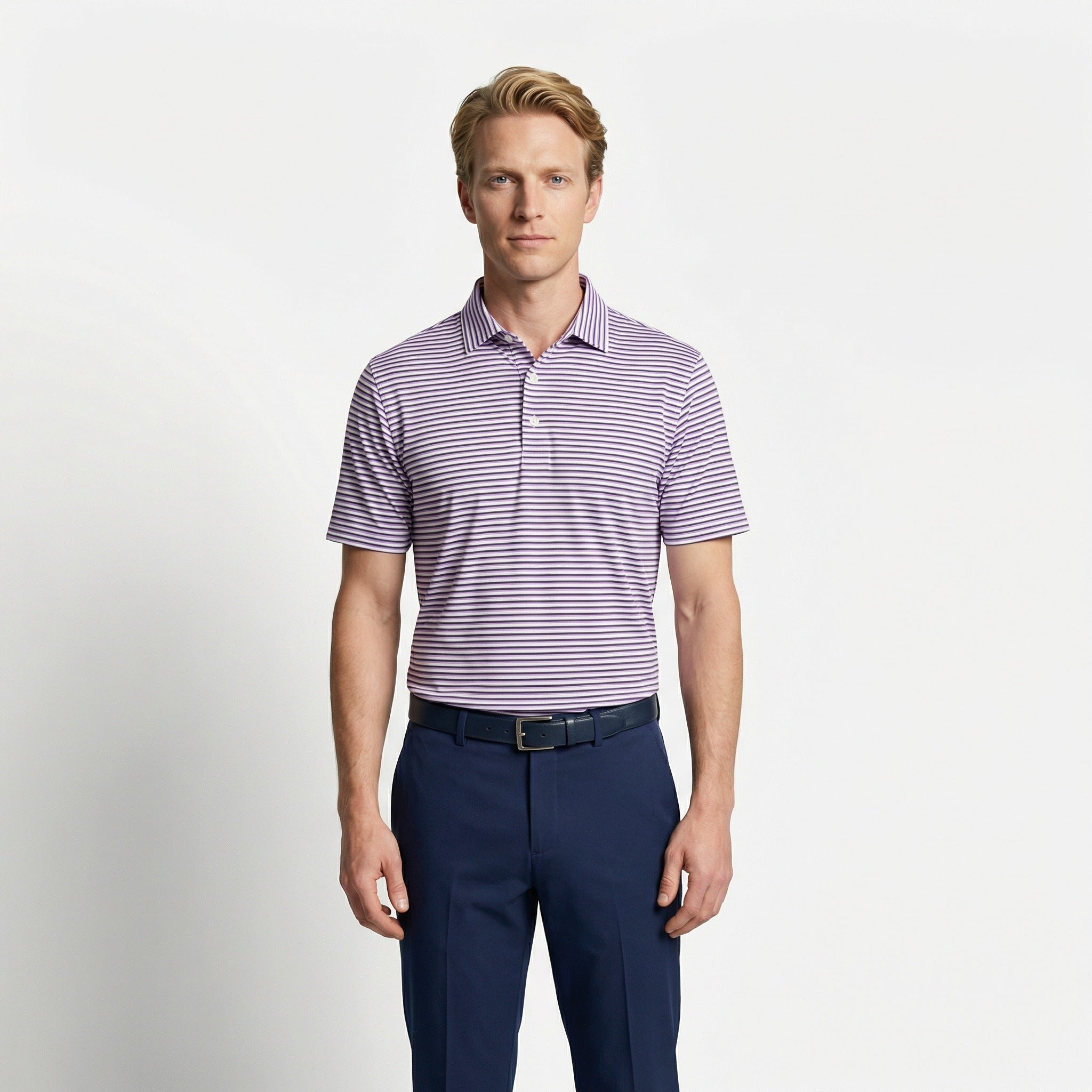 The Double Double is built around a clean, repeating double stripe pattern that hits that perfect balance—noticeable without being loud, classic without being boring. It’s the kind of shirt that looks just as right standing over a tee shot as it does walking into a meeting 20 minutes later.